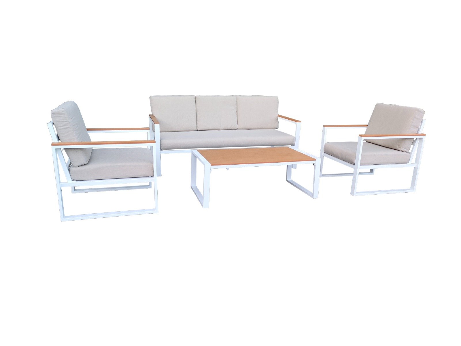¿Por qué elegir el Set Tulum? Su estructura de líneas rectas en color blanco aporta luminosidad y amplitud visual, mientras que los detalles en madera sobre los apoyabrazos y la mesa ratona suman la calidez necesaria para un ambiente acogedor. Los almohadones de alta densidad en tono crudo invitan al descanso prolongado.