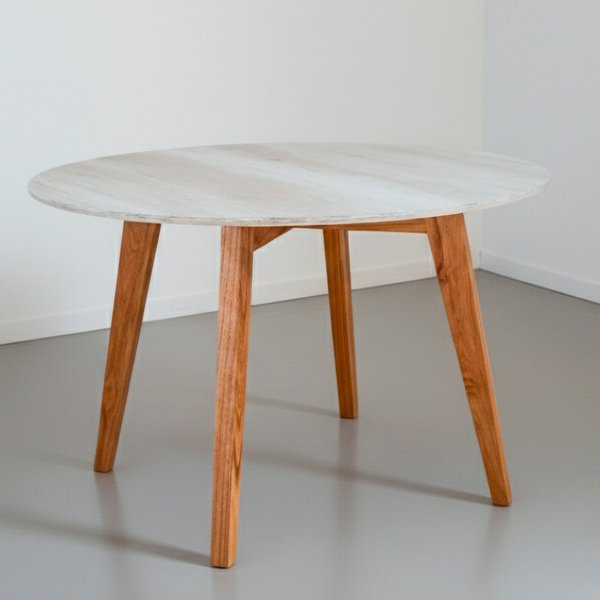 Patas de Madera Sólida: Cuatro robustas patas de madera clara con un acabado natural, dispuestas en un ángulo abierto, que ofrecen una excelente estabilidad y un toque orgánico que contrasta bellamente con la tapa.