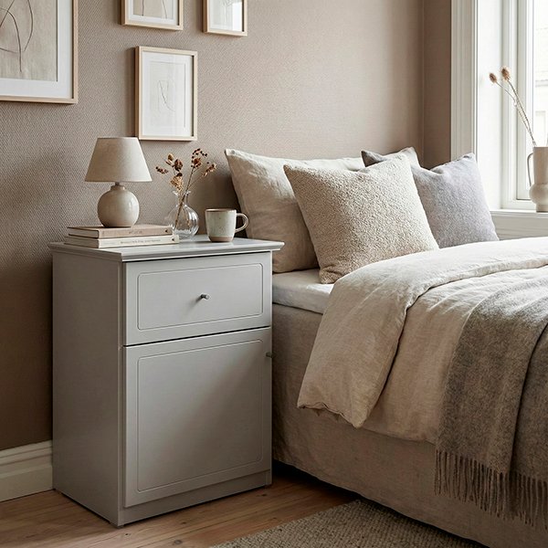 - Optimización del Espacio: A diferencia de las mesas de luz abiertas, el sistema de puerta y cajón permite mantener el desorden fuera de la vista, promoviendo un ambiente de descanso más relajado y despejado.