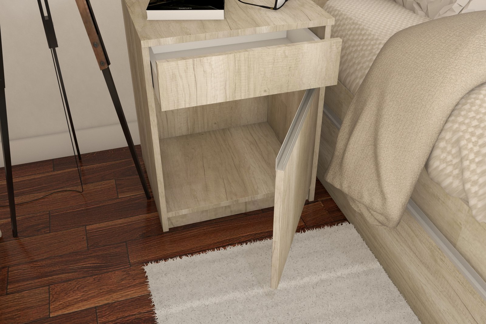 La Mesa de Luz Stylus Helsinky combina funcionalidad y estilo moderno, perfecta para cualquier habitación. Su diseño elegante incluye un cajón y una puerta, brindando un amplio espacio de almacenamiento sin sacrificar el estilo.