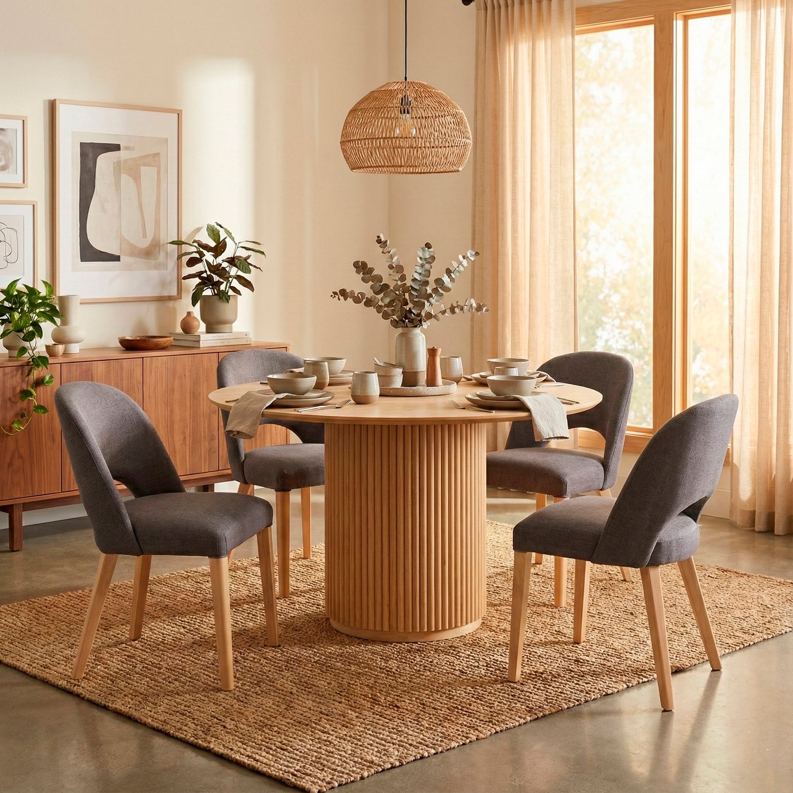 - Versatilidad: Su tono neutro y cálido combina tanto con sillas tapizadas modernas como con sillas de madera clásicas.