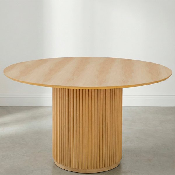 - Tendencia Varillada: El acabado acanalado de la base juega con las luces y sombras, convirtiendo a la mesa en una pieza de arte.
