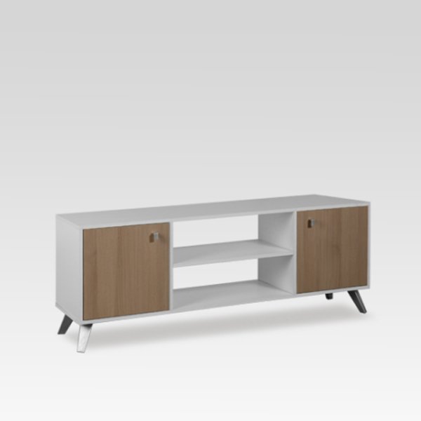 El diseño está compuesto por un cuerpo principal de melamina y patas de PVC. Este mueble posee tres divisiones internas, dos cerradas con puertas y una libre, con la intención de tener un espacio para exhibir elementos decorativos y artefactos que tengan controles remotos.