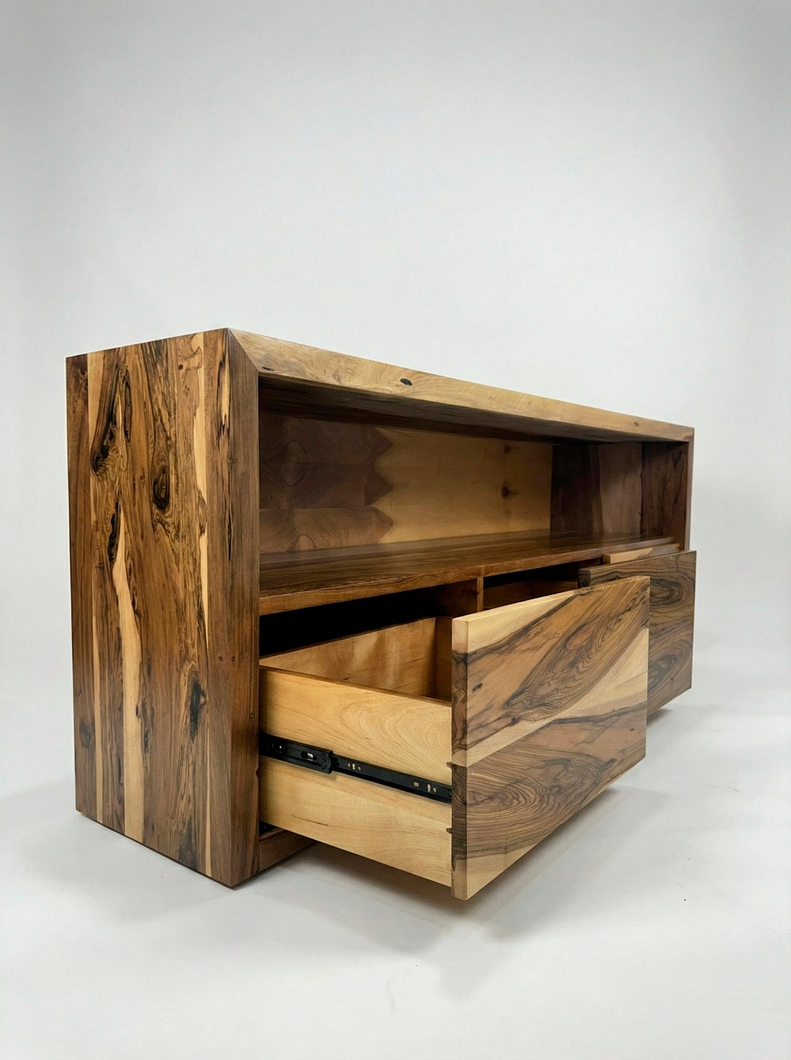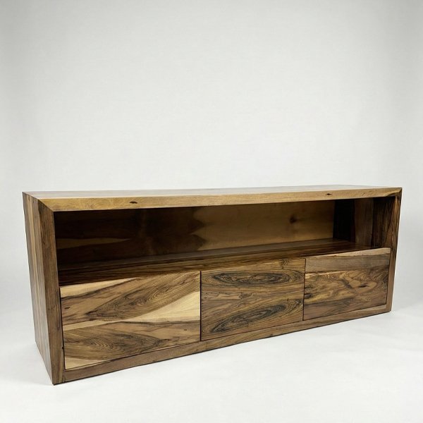 Su diseño se destaca por un amplio estante superior de nicho abierto, ideal para consolas, decodificadores o barras de sonido, y tres amplios cajones inferiores con guías telescópicas que garantizan un deslizamiento suave y silencioso. Lo que realmente lo hace especial es la selección de la madera: la Guayubira es famosa por su veta salvaje y contrastada, con tonos que van desde el crema hasta el chocolate oscuro, asegurando que cada mueble sea una pieza única e irrepetible.