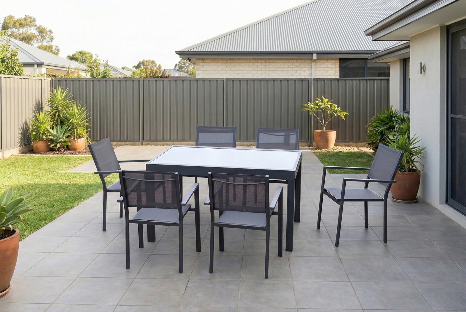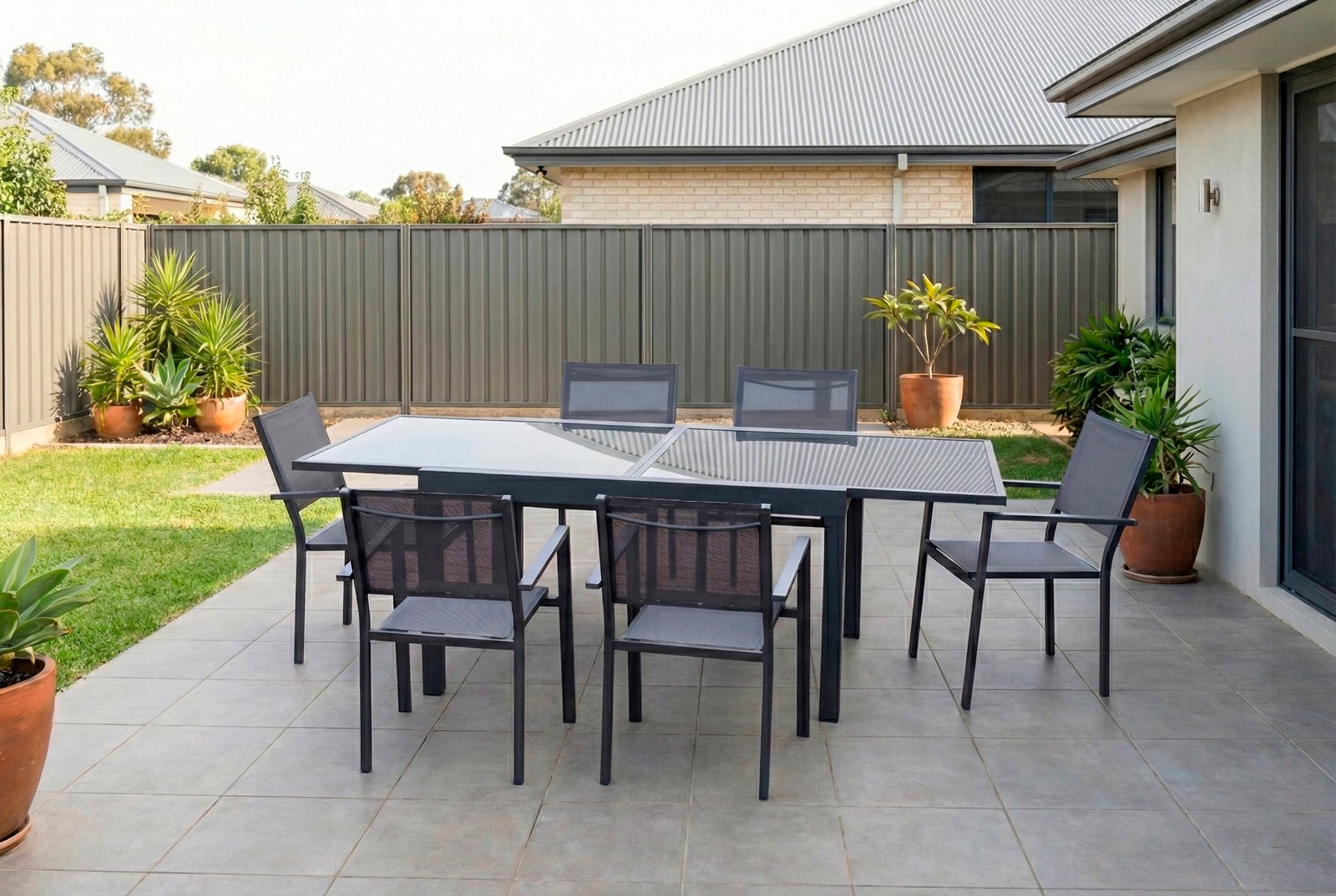 Versatilidad y Diseño Inteligente: La estrella de este conjunto es su mesa de jardín extensible. Su mecanismo permite ampliar fácilmente la superficie, pasando de una cena íntima a una reunión familiar numerosa en segundos. La tapa de vidrio templado aporta un toque sofisticado y es muy fácil de limpiar.