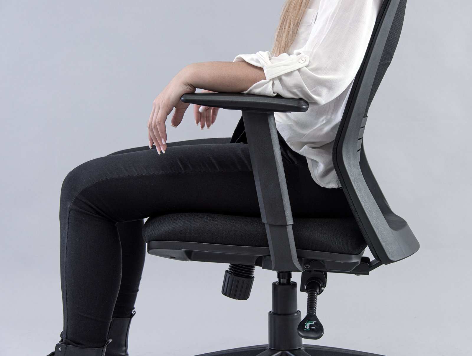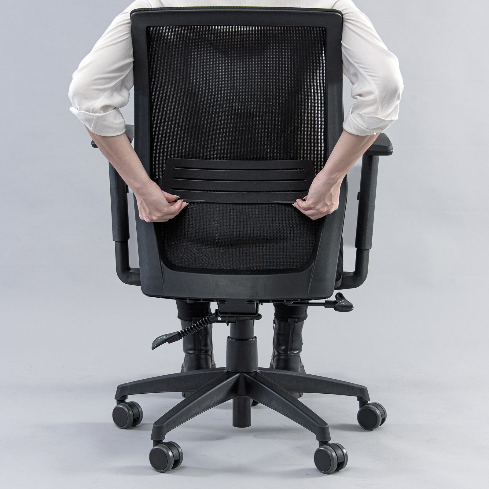 - Respaldo: Fabricado en polipropileno y revestido con tela de red mesh J1 negra, garantizando ventilación y un diseño elegante.