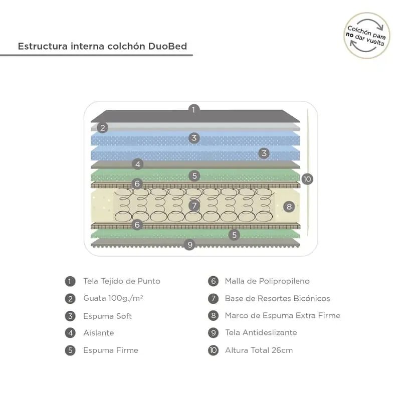 El colchón está diseñado de la base hacia arriba; utilizando materiales hipoalergénicos, durables y de alta calidad. Una novedosa construcción que permite que los colchones nunca sean dados vuelta, evitando así el esfuerzo innecesario que provoca la rotación de otros sistemas de descanso.